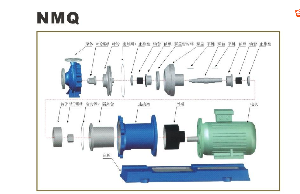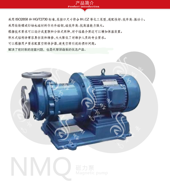 不銹鋼磁力泵全密封、無(wú)泄漏、清潔環(huán)保、運(yùn)行靜音低振,是輸送易燃、易爆、腐蝕、貴重液體的用泵。因節(jié)能環(huán)保、可靠安全,并替代進(jìn)口為用戶節(jié)約大量成本。廣泛應(yīng)用于化工、制堿、石油、醫(yī)藥、衛(wèi)生、農(nóng)藥、造紙、染料、污水處理等領(lǐng)域。 NMQ不銹鋼磁力泵高效節(jié)能、抗汽蝕性能強(qiáng),適用溫度范圍廣。具有運(yùn)行穩(wěn)定、噪音振動(dòng)低、可靠性高、壽命長(zhǎng)等優(yōu)點(diǎn),是堿液、醇類、各種有機(jī)溶劑等介質(zhì)的理想輸送設(shè)備。