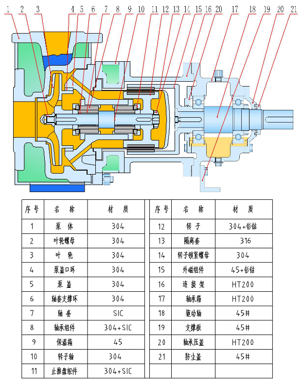 泵的過流部件根據(jù)使用工況和用戶要求可分別采用如:304、304L、302、321、316、316L、904、鈦合金、哈氏合金、鎳基合金等各類耐腐蝕材料。如有特殊需求,本單位可根據(jù)工況進行設計制造。