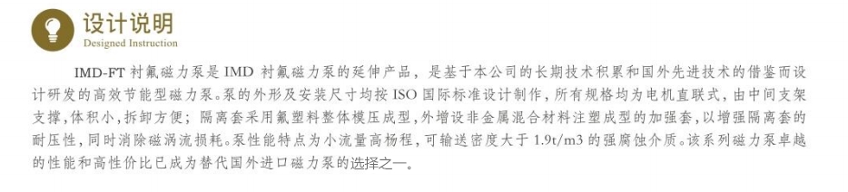 產(chǎn)品型號:IMD-FT氟塑料磁力驅(qū)動泵主要特點:工作溫度:-20℃~150℃ 流量:3m3/h~800m3/h 揚程:15m~125m
