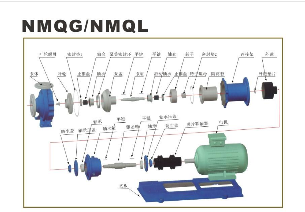 NMQ 型磁力傳動(dòng)離心泵(簡稱 NMQ 磁力泵),是我公司根據(jù)現(xiàn)在用戶和市場(chǎng)需求,結(jié)合市場(chǎng)上現(xiàn)有磁力泵的基礎(chǔ)上研究開發(fā)的新型無泄露耐腐蝕泵。主要由電動(dòng)機(jī)、磁力偶合器和耐腐蝕離心泵組成,是利用磁力偶合器傳遞動(dòng)力,無泄露。特點(diǎn)是利用電動(dòng)機(jī)帶動(dòng)磁傳動(dòng)器的外磁鋼旋轉(zhuǎn)時(shí),磁力線穿過間隙和隔離套,作用于內(nèi)磁鋼上,使泵軸與電動(dòng)機(jī)同步旋轉(zhuǎn),無接觸地傳遞扭矩。在泵軸的動(dòng)力輸入端,由于液體被封閉在靜止的隔離套內(nèi),沒有動(dòng)密封,因而杜絕了石油化工行業(yè)中免不了的跑、冒、滴、漏現(xiàn)象,實(shí)現(xiàn)無泄漏。