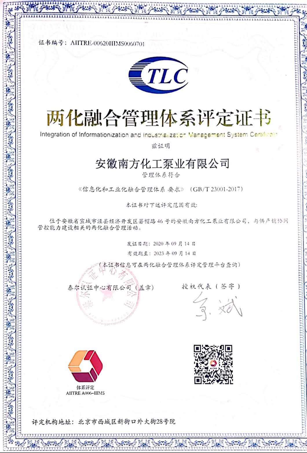 熱烈祝賀南方化工泵業(yè)榮獲《兩化融合管理體系評(píng)定證書》