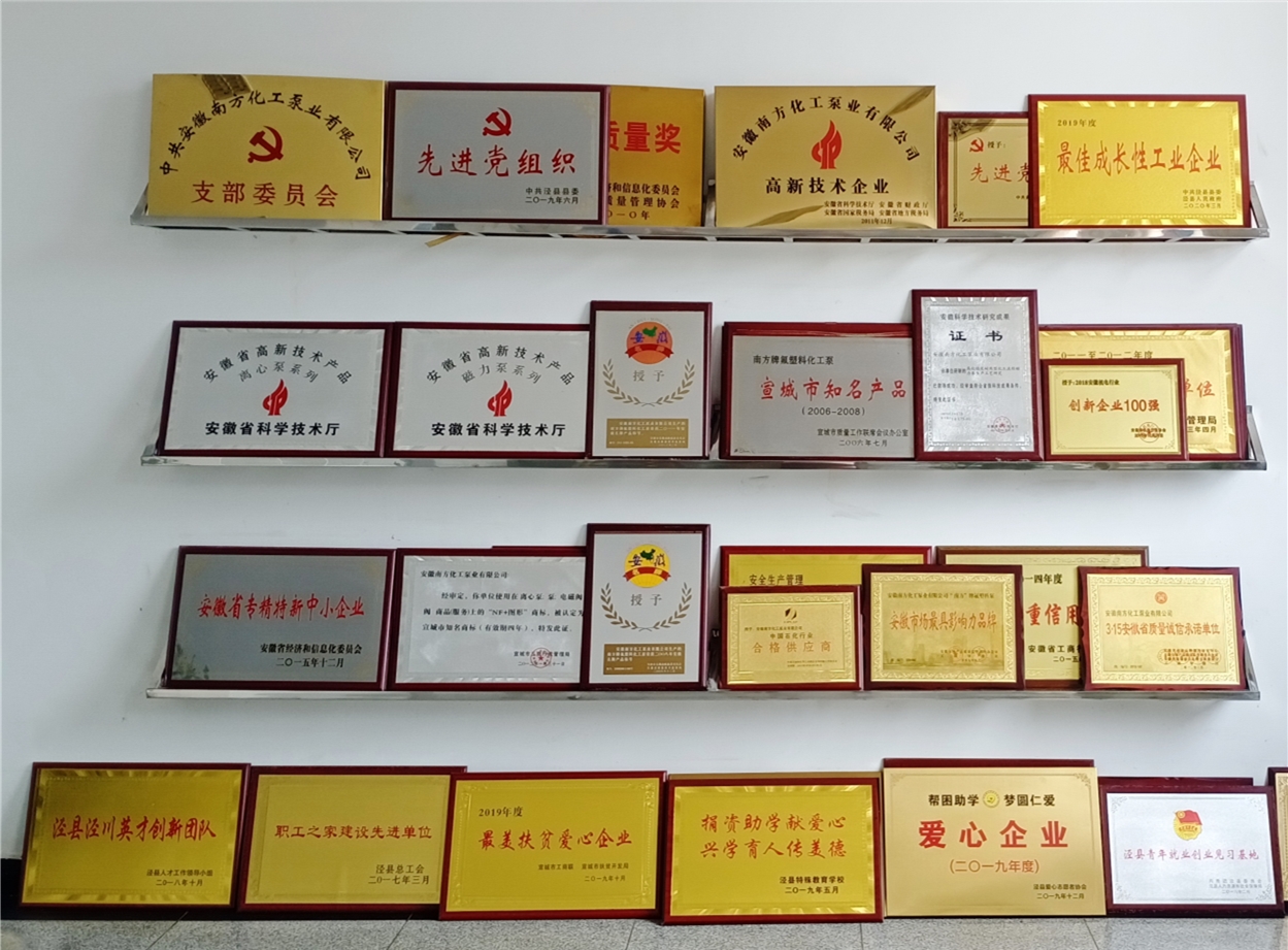 南方泵業(yè)先后榮獲“高新技術(shù)企業(yè)”、“安徽省著名商標(biāo)”、“安徽省名牌產(chǎn)品”、“安徽省創(chuàng)新型企業(yè)100強(qiáng)”、“安徽省質(zhì)量管理獎”、“安徽省科技型民營企業(yè)”、“AA級標(biāo)準(zhǔn)化良好行為企業(yè)”等稱號,新型高效節(jié)能化工流程磁力泵被安徽省科技廳認(rèn)定為“高新技術(shù)產(chǎn)品”。擁有18項磁力泵、襯氟泵領(lǐng)域關(guān)鍵技術(shù)專利,南方泵業(yè)正引領(lǐng)著金屬磁力泵和襯氟泵產(chǎn)品的發(fā)展方向。產(chǎn)品服務(wù)于石油化工、生物制藥制酸、新能源、新材料、電力、冶金等領(lǐng)域的關(guān)鍵工藝上,解決了腐蝕與泄漏的難題,南方化工泵業(yè)堅持以“專注于腐蝕與貴重流體的安全輸送”為理念,以“節(jié)能、環(huán)保、安全”為宗旨,以振興民族工業(yè)為己任,努力打造性能可靠、客戶滿意的泵閥精品,服務(wù)于國內(nèi)外用戶。