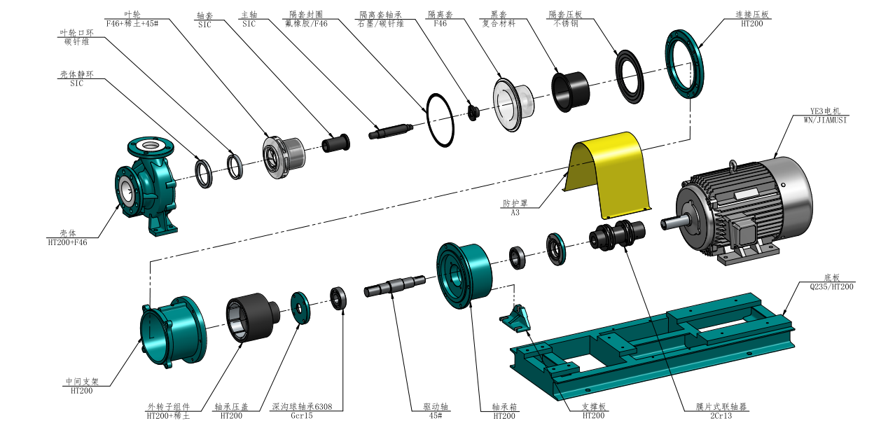 IMD-FTL氟塑料分體式磁力泵簡稱“IMD-FTL襯氟磁力泵”-主要部件采用鋼襯F46/PFA,泵體強(qiáng)度高,隔離套采用氟塑料整體模壓成型,大大降低了磁渦流損耗,可輸送高濃度、密度大于1.9t/m3的強(qiáng)腐蝕性介質(zhì)。 襯氟磁力泵驅(qū)動形式為磁力間接無接觸驅(qū)動,內(nèi)外磁體間用隔離套隔離,使泵腔處于封閉狀態(tài),耐強(qiáng)腐蝕,無泄漏,泵殼有底腳,泵和電機(jī)固定在共用的的底座上,穩(wěn)定性好,運(yùn)行噪音和振動更低。從而防止了滴漏現(xiàn)象,不會污染使用場地,特別適合于輸送強(qiáng)酸強(qiáng)堿性、強(qiáng)氧化性、易燃易爆性、毒性、揮發(fā)性介質(zhì)。