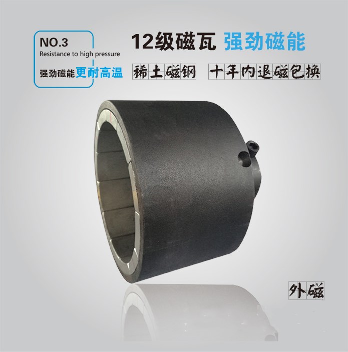 CQB-FP氟塑料磁力泵是利用永磁聯(lián)軸器工作原理無接觸的傳遞扭矩的新型泵,當(dāng)原動機(jī)帶動外磁鋼轉(zhuǎn)子時(shí),通過磁場的作用驅(qū)動內(nèi)磁鋼轉(zhuǎn)子同步旋轉(zhuǎn),而內(nèi)磁鋼轉(zhuǎn)子和葉輪連成一體,從而達(dá)到無接觸帶動葉輪轉(zhuǎn)動之目的。由于液體被封閉在靜止的隔離套內(nèi),因此該泵是一種全封閉、無泄漏的泵型,杜絕了機(jī)械密封離心泵不可避免的跑、冒、滴、漏的弊病。