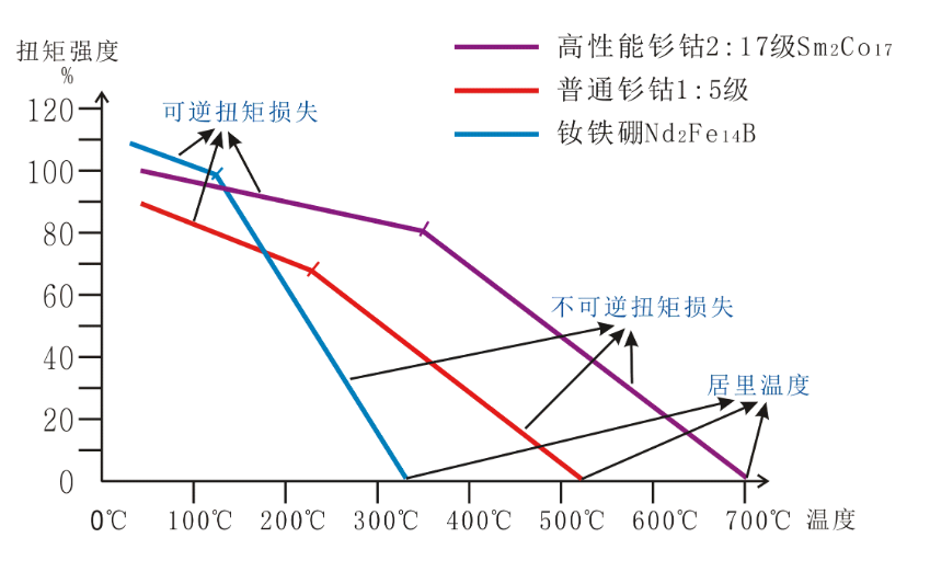 當(dāng)溫度超過(guò)350℃,高性能釤鈷材質(zhì)的磁鋼將會(huì)進(jìn)入不可逆扭轉(zhuǎn)損失。
