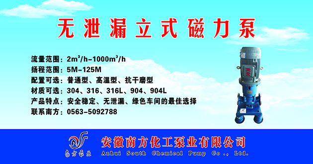 此次展會(huì)安徽南方化工泵業(yè)將展出多種無(wú)泄漏環(huán)保磁力泵。包括:無(wú)泄漏襯氟磁力泵、無(wú)泄漏金屬磁力泵等等。